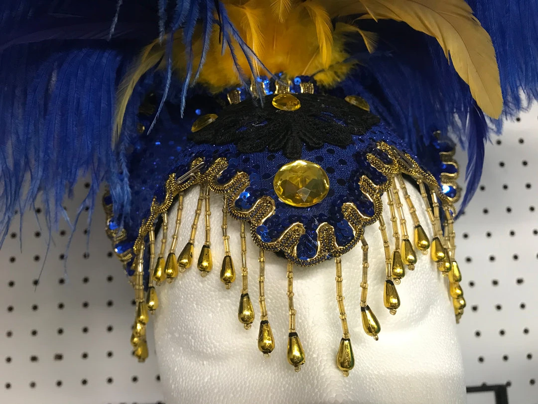 Sequin burlesque structured headpiece with gemstones, beaded fringe and elastic across back to secure. Incorporates extra large ostrich, rooster and pheasant feathers.