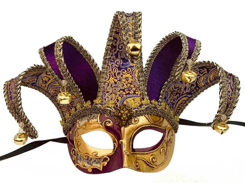 Mask with gold scroll and music notes and wired jester adornment with attached bells. Ribbon ties to secure.