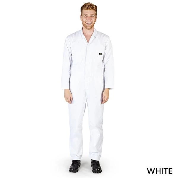Men’s long sleeve coverall has 2 side pockets, 2 chest pockets, and 2 back pockets with lapel collar. Heavy duty upper body zipper with snap button closure. Elastic waist area. 31″ pants inseam.Â