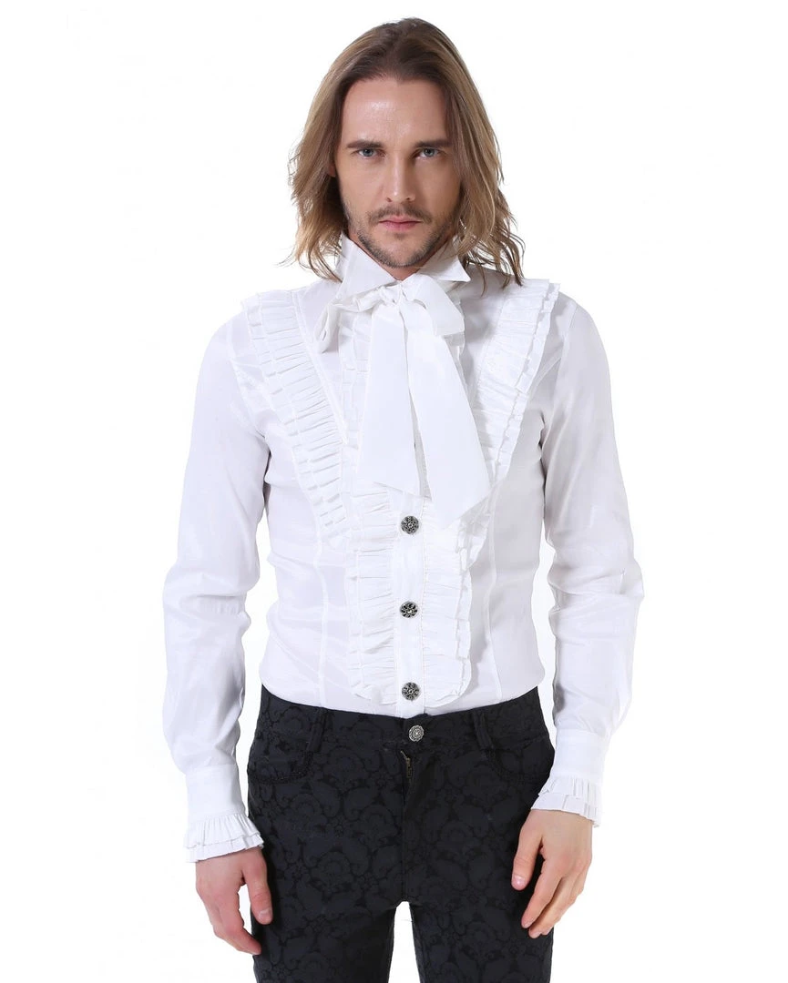 Taffeta gothic men’s shirt with front ruffle and ribbon tie.